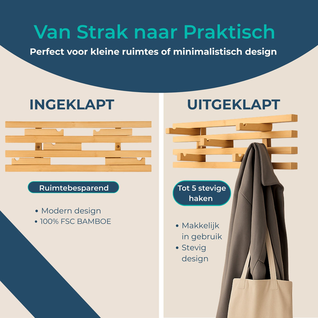 - 5 stevige haken: Ruimte genoeg voor jassen, handdoeken of tassen;